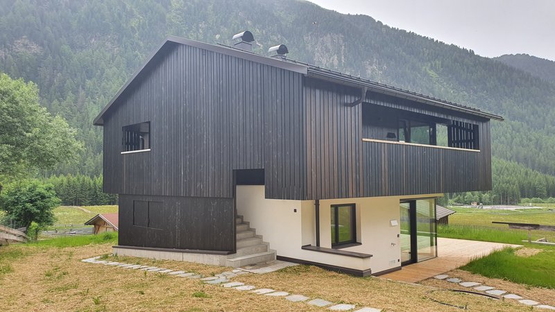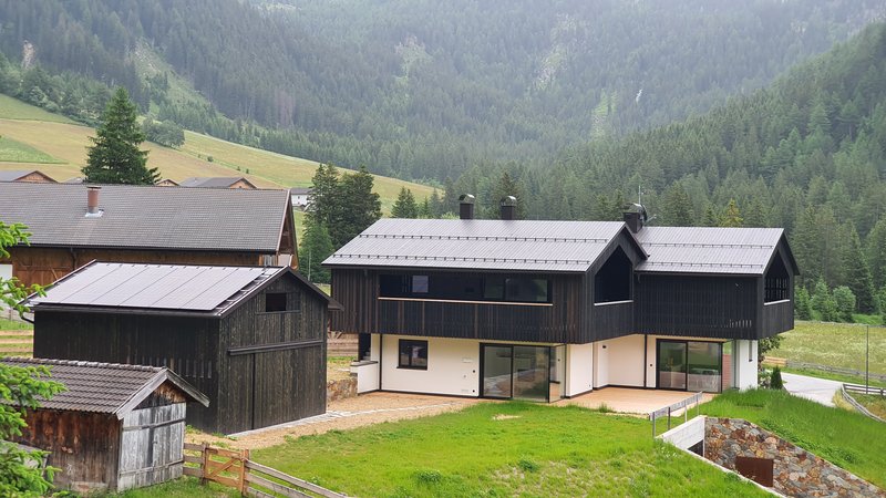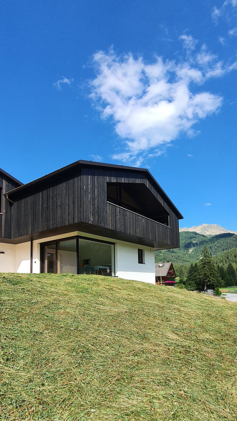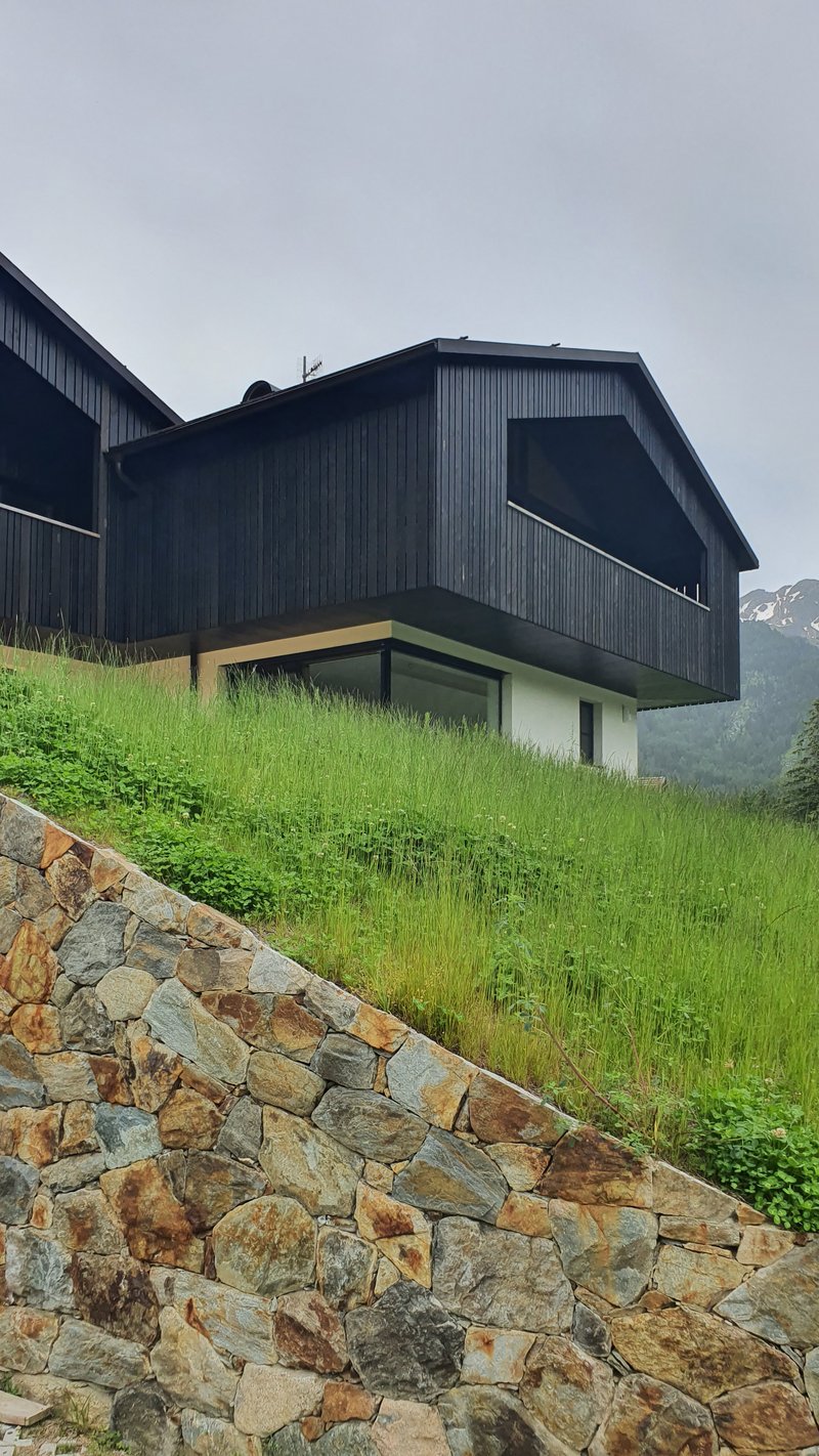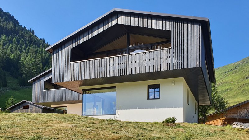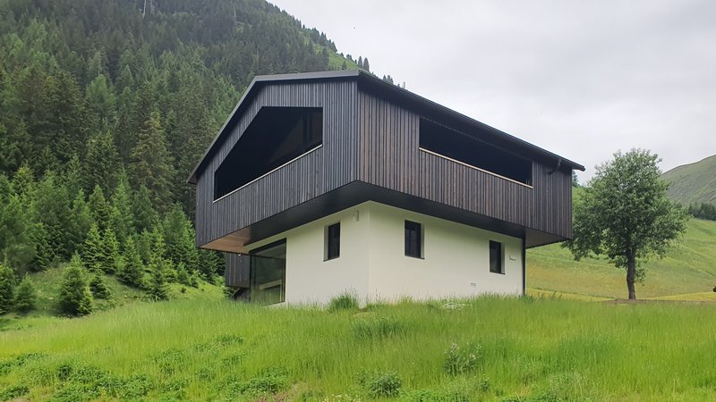 Die Gliederung der Kubatur in drei kleine Satteldachvolumen und deren behutsame Einbettung in das Gelände schaffen ein stimmiges Gesamtbild. Durch die Anordnung der Baukörper entsteht ein geschützter Vorbereich – ein Ort des Ankommens und Verweilens mit eindrucksvoller Aussicht auf die Sarntaler Bergwelt.